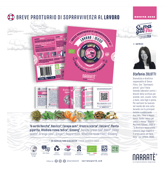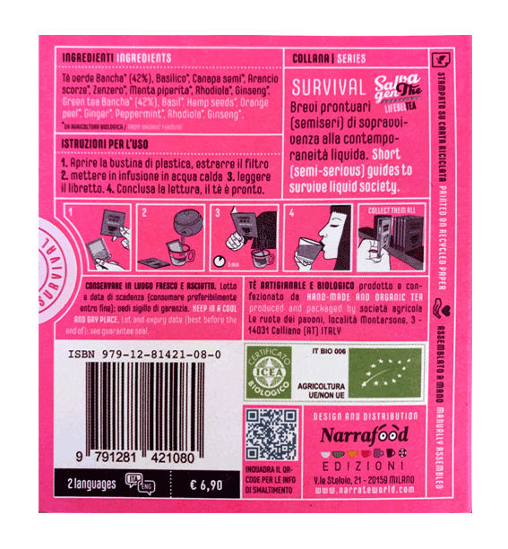 Oltre ai 10 paragrafetti del testo dedicato all’infusione, abbiamo dedicato 2 pagine con gli esercizi psicofisici di sopravvivenza a cura della redazione Narrafood, come i suggerimenti delle letture di sopravvivenza. L’ultima pagina del libretto ospita il qr-code necessario ad accedere ai relativi contenuti multimediali.