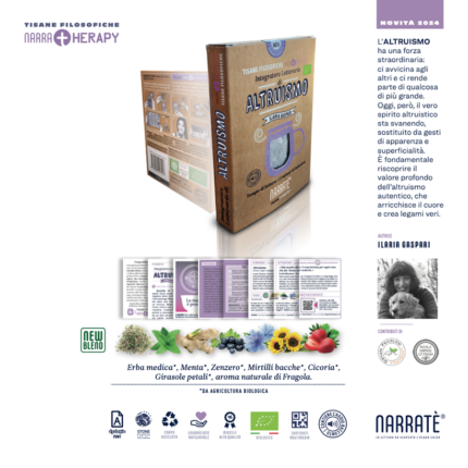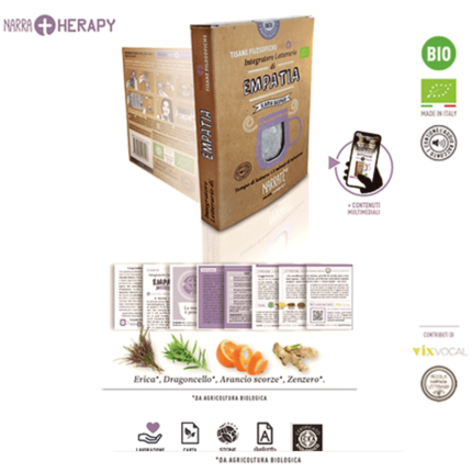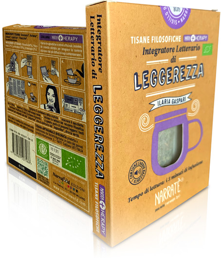 Le Tisane Filosofiche NarraTherapy sono un rimedio olistico composto da parole terapeutiche e infusi officinali biologici, fruibili attraverso il format Narratè®: la lettura che dura il tempo d’infusione. Racconti e tisane che insieme si potenziano vicendevolmente con l’intento di colmare le carenze all’origine dei più diffusi disagi contemporanei, per questo le definiamo Integratori Letterari. La confezione a scatolina si ispira a quella dei medicinali e il “sincerino” contenuto, ovvero un bugiardino che dice la verità, ospita sia i testi che il filtro della tisana, biologica e artigianale, formulata ad hoc per ogni singolo titolo.